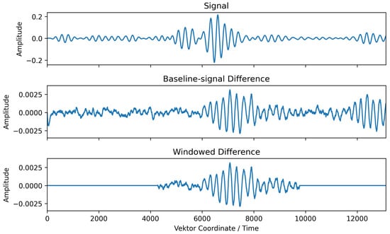 The window is then set to 1500 values (which corresponds to 0.15 ms) before this position (k corresponding to ) to make sure to include the whole signal in the window, and to 5500 values (0.55 ms) after this position to include some scattered waves, too. This is performed because it can be assumed that the relevant information about the damage will be on the pitched signal or at least in its direct vicinity. The window is then applied on the difference of the received signal to the master baseline. Figure 5 shows the effect of the window function applied to the difference between the measured signal and the corresponding master baseline. As a consequence, the rest of the vector is obtained padding zero elements. When applied in code, only the non-zero part is used for further processing.