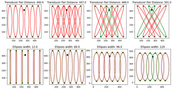 (Top) Ellipses for the different TP-distances (in [mm]) with a width scale of 60 mm. (Bottom) Ellipses for different width scales (in [mm]) for a constant distance of 440 mm. Green ellipses includes example damage.