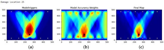 The typical result is reported in Figure 7. The algorithm constructing the heat map that operates threefold calculations has three main steps: (i) counting the number of models that look at each coordinate point (CP) or spot (depending on resolution), (ii) counting how many of these models return a damage prediction for this CP, and (iii) weighting the accuracy of the model. This way, two heat maps are constructed from the first two steps: the model counter map (which is the same for each damage or measurement), and the model trigger map. These two maps are further combined into a probability map, which also uses the approximate accuracy of the model to consider false triggers.