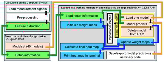 To program the chip, the relevant drivers are downloaded from its official website [29] and the programming is performed in the Visual Studios (VS) application https://platformio.org/ Platform IO. For this purpose, a GitHub-repository [30] is copied and used as a base reference. Figure 9 shows a flow chart picturing the different steps completed on the chip and the preparations performed in Python. The three gray boxes represent the different kinds of computational resources used. The feature extraction is performed not on the tiny device but on the computer using Python (upper left gray box). The extracted features are saved together with the setup information and the entire final model set (which is trained and optimized in Python on the PC) on the drive of the edge device (lower left gray box). The setup information includes the transducer positions, the ellipses function, and information about what features belong to what TP. The right gray box represents the RAM of the tiny device. It shows what has to be loaded into the working memory and is calculated directly on the edge device. The colors represent the different kinds of information. Orange follows the models, green follows the features (and TP-information), and blue follows the information for the heat map construction. The white boxes are the input and output of the total system, and the black arrows represent a straightforward calculation or process step. The two smaller boxes (light gray and yellow) represent two loops that load one model after the other, iterating over the width and length of the ellipses that correspond to the models.