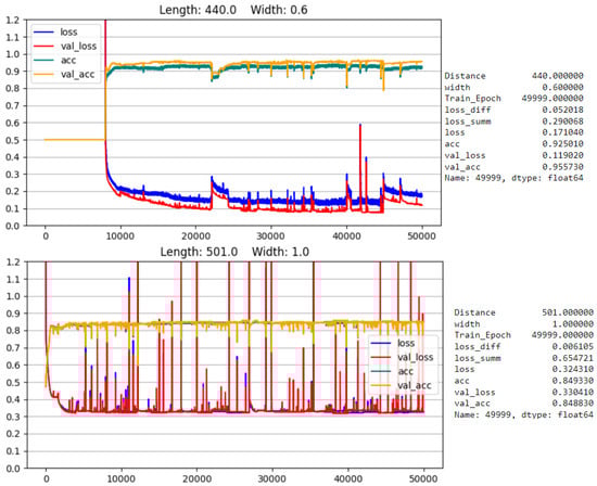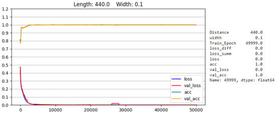 For each parameter set, one model set is trained. An example of singular model training results (for the final model set) can be seen in Figure 10. The training results consist of the results for the training data (which are called loss and in the graphs) and the results for the evaluation data (which are called val_loss and val_acc in the graphs). The loss represents the average result of the loss function on this dataset, while accuracy () describes the average rate for correct predictions of the model. For the evaluation (or test) dataset, one damage of each of the squares (which arrange four damages together; see Figure 3b) is taken out of the training data to evaluate the models. The different damage scenarios taken out of the squares have alternating relative positions: upper right corner for the first damage batch, lower left corner for the second, lower right for the third, and so forth. The evaluation damage locations are [, , , , , , ]. Furthermore, to prevent models from learning arbitrary biases, the actual training data are a subset that has one half its training data return a “0” and the other a “1”.