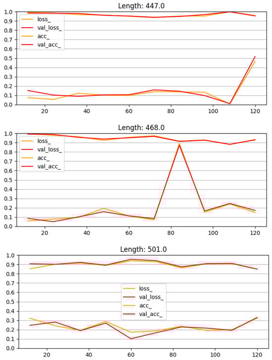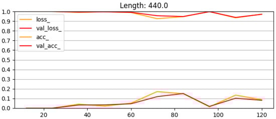 Likewise, Figure 11 shows an overview of the accuracies and losses for the final model set at different lengths. The peaks in the losses are training cycles where the model becomes stuck in the training loop at higher losses. These ones could be retrained manually outside of the loop, but this action is not performed because they still have comparable accuracy to the other training results. It is worth noting that the training is not performed on the edge device and the models achieve an acceptable accuracy which means that they consistently reach over 90% accuracy.