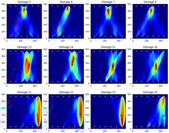 Some of the heat map results obtained with the aforementioned model are displayed in Figure 12. In particular, the first row shows the areas with the average best localization results (the borders close to the transducers); the second row shows the areas that have still quite good localization which can vary a bit (in the middle of the SHM-Plate); and the last row shows the area that has the worst localizations (at the edges without transducers). The last row also contains the only heat map which could be classified as a wrong prediction (damage 24), which is the only heat map where the actual damage is not in the red area (even though it is still in the highlighted area). However, taking a better look into this damage prediction, it is worth noting that this area of the plate is characterized by a poor coverage, making the localization challenging. However, this issue can be mitigated by having extended the coverage. Generally, it is worth noting that this approach has very high accuracy in terms of having the damage location in the highlighted area. Indeed, not a single heat map predicts the damage on a completely different side of the plate.