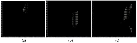 To give a better explanation of the weighting procedure, it is worth noting that Equation (3) is meant to provide the probabilistic weights including the possibility of models making wrong predictions. To this end, the average accuracy (equal to 0.95) of the models is weighted by all triggers, while the probability for a false prediction (equal to 0.05) is weighted by the difference between the number of models that cover the given coordinate point and the ones triggered. This is the most simple yet effective attempt to include the model accuracies to the weights. Equation (4) scales the results of Equation (3) to get rid of some artifacts and manage the influence of Equation (4) in Equation (5). This scaling (the logarithm) is adjustable and influences the localization and production of artifacts and can be fine-tuned further. In Equation (5), the relation of the actual number of triggered models and models covering the coordinate point is merged with these probabilistic weights. The logarithm is used for scaling reasons, while the + 1.1 constant factor is introduced to prevent artifacts from dividing through 0.