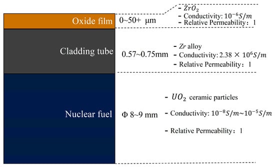 The typical structure of a fuel rod is illustrated in Figure 1. The nuclear fuel is non-conductive, rendering its effect in ECT negligible. The material of the cladding is Zr alloy, with a conductivity and relative permeability approximately 1.6 × 106 S/m and 1, respectively. The thickness of the tube ranges from 0.57 to 0.75 mm. The thickness of the oxide film typically ranges from a few micrometers to several tens of micrometers. The oxide film on the fuel rods is primarily composed of ZrO2, which is known to be non-conductive in the low-temperature range (room temperature to 600 °C) [29]. Both the laboratory experiments conducted at room temperature and the poolside inspections, typically carried out at temperatures ranging from approximately 25 °C to 60 °C, occur in a temperature range far below the threshold where ZrO2 exhibits a significant increase in electrical conductivity. Therefore, the oxide film can be considered electrically insulating under these conditions.