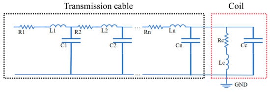 The impedance seen at the left-hand side of the nth unit () is written as (4). Then, the impedance seem at the left-hand side of the (n − 1)th unit () is written as (5). The calculation is repeated n times to obtain the impedance of the coil and the cable () seen by the instrument, as written in (6).