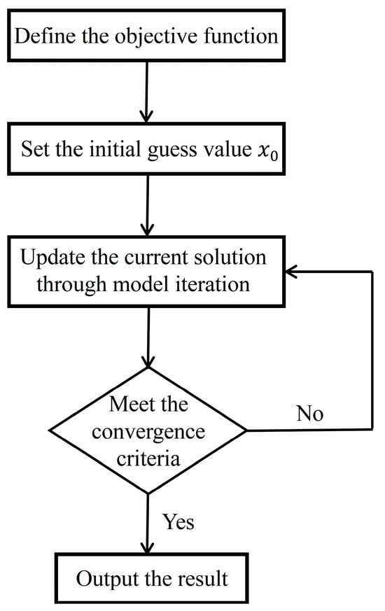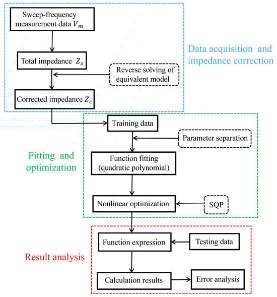 As the characteristics of the transmission cable are known, the corrected impedance can be solved from . The flowchart of the calculation is shown in Figure 4. First, the objective function is defined, and an initial guess value is assigned to initiate the iterative process. Subsequently, the current solution is updated iteratively by substituting the guess value into the equivalent circuit model. After each iteration, the updated solution is evaluated against predefined convergence criteria. If the solution does not meet these criteria, the process returns to further iterations to refine the solution. This iterative procedure continues until the convergence criteria are satisfied. Once convergence is achieved, the final output represents the result obtained through reverse calculation.