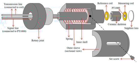 The structure of the probe is illustrated in Figure 6. It consists of two coils and a PT1000 thermistor (Heraeus, Hanau, Germany). A spring mechanism is integrated into the design, applying consistent pressure on the inner shell to ensure stability and maintain firm contact between the probe and the surface of the fuel rod. The measuring coil is protected by a durable, heat-resistant sapphire lens, which is crucial for allowing the probe to glide smoothly along the surface of the fuel rod. The PT1000 sensor monitors the temperature, enabling real-time temperature compensation during measurements. The parameters of the coil are listed in Table 1.