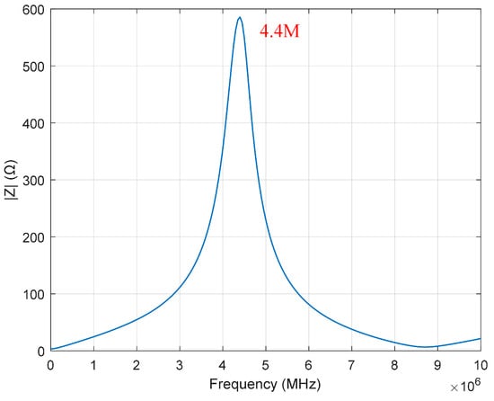 The length of the cable is 10 m. The frequency characteristic of the coil and the cable is measured using an impedance analyzer E4990A (Keysight Technologies, Santa Rosa, CA, USA). The frequency characteristic curve is depicted in Figure 7.