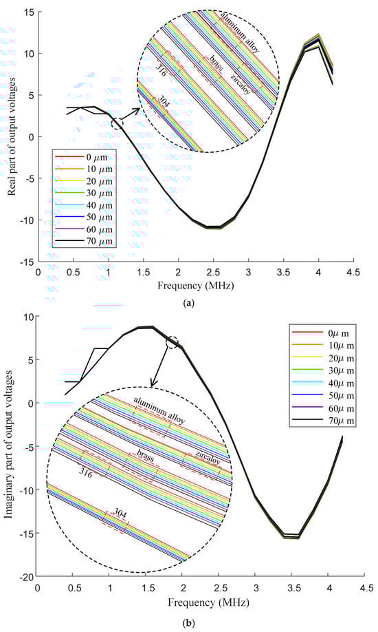 Figure 10 illustrates the in-phase and quadrature components of voltage , measured at frequencies ranging from 0.4 MHz to 4.2 MHz for the five samples with varying electrical conductivities. In the figure, different colors are used to distinguish the various oxide film thicknesses. It seems that the recorded voltage is not monotonously correlated to the frequency, which is not suitable for the swept frequency technique. This is due to the effects of the cable.