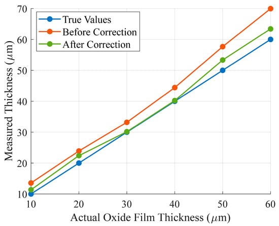 To evaluate the impact of impedance correction on accuracy, a comparative analysis was conducted by examining the data before and after the application of impedance correction. The data were processed by subtracting the baseline measurement taken with a 0 μm oxide film thickness. Figure 12 compares the thickness of the zirconium alloy samples derived from the data before and after impedance correction. Given that the cladding tube material is generally zirconium alloy, measurement data from four materials—304 stainless steel, 316 stainless steel, brass, and aluminum alloy—were utilized for curve fitting, while the measurement data from the zirconium alloy samples were employed as the test set. Various fitting functions were developed utilizing the data prior to and subsequent to impedance correction. Subsequently, the measurement data of the zirconium alloy samples were incorporated into these fitting functions for validation, resulting in the thickness measurement outcomes of the zirconium alloy samples prior to and following impedance correction. In Figure 12, the blue curve represents the actual oxide film thickness, the red curve represents the thickness calculated without impedance correction, and the green curve represents the thickness calculated with the corrected impedance. The results demonstrate that the thickness derived from the corrected impedance aligns more closely with the true value, demonstrating the effectiveness of the method.
