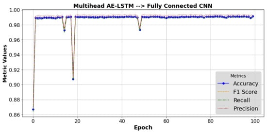 In evaluating the AE-LSTM + CNN approach, we conducted a performance assessment that focused on important aspects of intrusion detection. This evaluation includes key metrics: accuracy, the F1 score, recall, and precision. Accuracy measures a model’s proficiency in correctly categorizing normal and dangerous activities. The F1 score, which provides a balance between precision and recall, indicates a model’s ability to identify threats while minimizing false alarms. Recall evaluates the model’s accuracy in recognizing all threats, while precision assesses its ability to avoid misclassifying non-threats. These four indicators offer a thorough assessment of the model’s effectiveness in enhancing IoT networks as a defense against cyber threats.