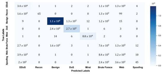 Based on the resulting TP, FN, FP, and TN metrics for each class, we computed the accuracy, F1 score, recall, and precision, detailed in Table 7. The average performance of the model across all metrics (accuracy, precision, recall, and the F1 score) in detecting benign, DoS, and Mirai attacks exceeds 99%. In contrast, the accuracy for DDoS, recon, brute force, web, and spoofing attacks exceeds 99%, whereas precision, recall, and the F1 score differ significantly. The conducted analysis indicates that the dataset’s size remarkably impacts the performance metrics of each class of attack. When we carry out detailed examinations, the number of samples varies, which greatly affects the accuracy, precision, recall, and F1 score metrics across different attack classes. Thus, these results highlight the significance of considering dataset sizes in order to enhance the effectiveness of deep learning models in cybersecurity.