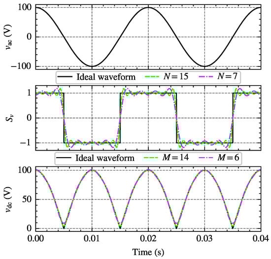 can be represented using a Fourier series, while is a set of sine and cosine functions containing the fundamental voltage. By appropriately transforming the product of the two terms through trigonometric transformations, the frequency-domain expression of can be obtained. Figure 1 illustrates the process of obtaining DC voltage by modulating AC voltage with a switching function. Here, , and is given by (5).
