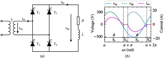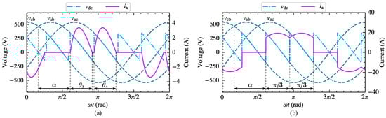 The three-phase bridge-controlled rectifier circuit consists of six thyristors, which can be divided into a common cathode group () and a common anode group () in accordance with the different connection modes. During normal operation, the trigger circuit generates appropriate pulse signals to control the conduction sequence and timing of the thyristors in both groups, thus regulating the rectified output voltage. As shown in Figure 6a, when the load current is intermittent, the phase-A current on the AC side exhibits two non-zero operating stages within the positive half fundamental period, corresponding to thyristor conduction angles and , respectively.