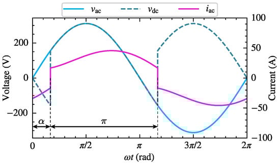 Compared to the intermittent current condition, the initial current of the thyristors under continuous current conditions is no longer zero, and the thyristor conduction angle . When , thyristors and conduct, and the DC side load is supplied by . When , thyristors and are turned off, another set of thyristors and conduct, and the DC side load is supplied by .