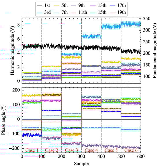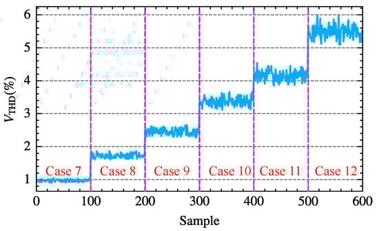 Table 4 lists six voltage cases with fluctuations ranging from 0.97% to 5.51%. For each given case, the voltage magnitude and phase at different orders are set with a certain range of fluctuations according to (54), generating 600 different supply voltage scenarios. Figure 13 illustrates the total harmonic distortion of the voltage for these scenarios. Simulations with varying parameters are conducted on the three-phase bridge rectifier circuit using the above supply voltages and thyristor trigger angles, and the voltage and current data of phase-A at PCC are sampled. Subsequently, waveform data from five fundamental periods are selected for FFT analysis to calculate the voltages and currents of different orders.