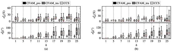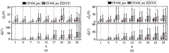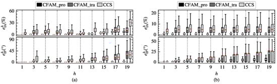 To further compare the modeling performance of the harmonic models, the amplitude relative error and the phase absolute error of different order currents in the test samples are calculated separately. Figure 19 demonstrates the distribution of and for the three harmonic models under intermittent and continuous load current conditions. It can be observed that the mean errors and the width of the box plots for the analytical CFAM model calculated using the proposed method are generally smaller than those for the CCS model and the traditional CFAM model, indicating that the proposed method achieves higher modeling accuracy and narrower range of error fluctuations.