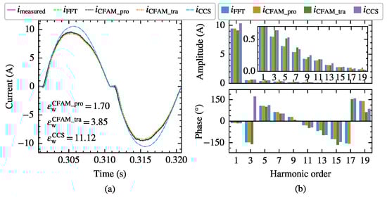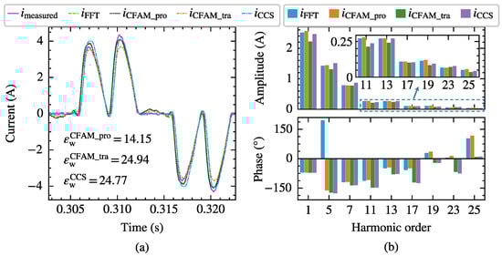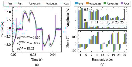 The current measurements and model estimates for the three-phase bridge rectifier under operating state. (a) Comparison of current waveforms. (b) Comparison of current amplitude spectrums and phase spectrums.