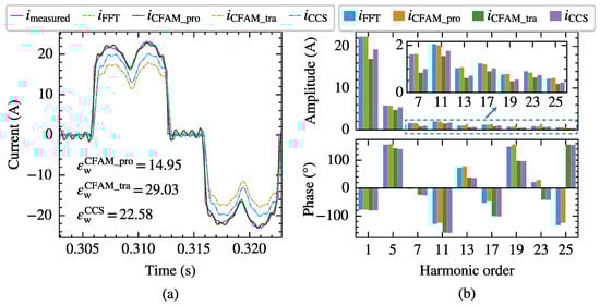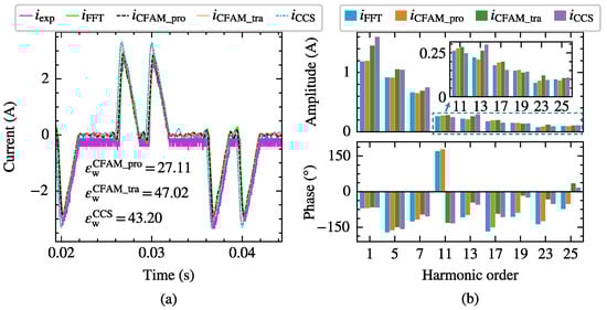 Taking the scenario supplied by the voltage in Case 12 with a trigger angle as an example, the harmonic modeling performance of the harmonic models for the three-phase bridge rectifier is compared. Figure 15 and Figure 16 present the waveforms and spectrum comparisons of the measured current and the model estimates under intermittent and continuous load current conditions, respectively.