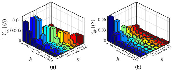 where , , is the total number of harmonics considered; and denote the phasor matrices of different order currents and voltages at PCC, respectively; represents the CFAM of the harmonic source, and its matrix element denotes the first-order partial derivative of the h-th current with respect to the k-th voltage. As noted in [25], since corresponds to the ratio of current and voltage at different orders, it is called “crossed frequency admittance” for convenience. Additionally, a method for calculating the harmonic source CFAM based on small signal operations is provided in [25], which mainly consists of the following two steps:
