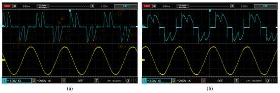 The measured waveforms of the AC−side resistor voltage (blue line) and the secondary winding line voltage (yellow line) under the two operating states of (a) and (b).