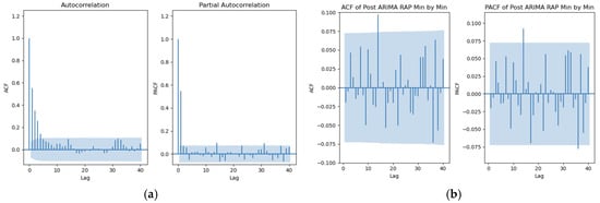 ACF and PACF plots at minute-by-minute temporal resolution—patient example. (a) RAP pre-ARIMA plots, (b) RAP post-ARIMA (3, 1, 3) plots.
