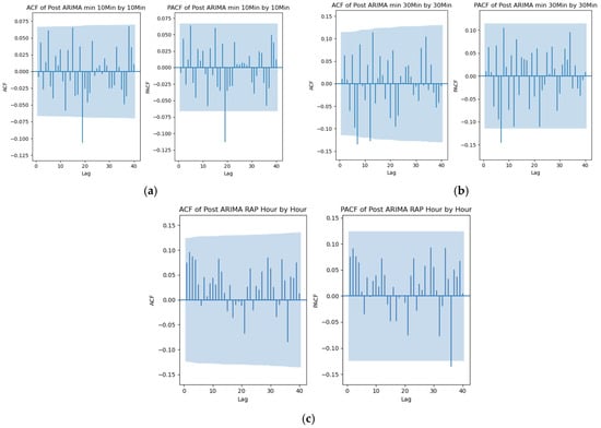 The figure documents the ACF and PACF of the residuals of the RAP-mapped ARIMA structure in the (a) 10-min-by-10-min, (b) 30-min-by-30-min, and (c) hour-by-hour relationships.