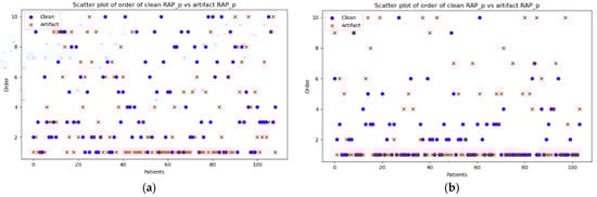 The figure demonstrates the values of the q-orders from the optimal ARIMA models of RAP’s clean vs. artifact group at (a) minute-by-minute resolution and (b) 10-min-by-10-min resolution.