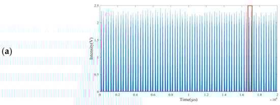 More specifically, in one cycle time of 1/1800 s, the angle of the optical grating in the QCL assembly is turned clockwise and then counterclockwise for a complete period such that 100 broadband QCL pulses are sharpened to a train of 100 narrow pulses each with a full pulse width of 100 ns (equivalent to 0.07 cm−1), and with the first 50 ramping up from 935 to 1128 cm−1 and the next 50 ramping down from 1128 cm−1 back to 935 cm−1 (hereafter referred as a full cycle). Readily shown in Figure 2, the cycle time for the QCL to emit 100 pulses is purposedly set at 1/1800 s which is asynchronously off by 0.154 µs (1/36 of the pulse-to-pulse separation) from the full cycle time of 555.555 µs in which 100 pulses are emitted by the QCL. Due to this exact asynchronization setting, the emission pulses of one full cycle are all off by 0.154 µs (equivalent to 0.107 cm−1) relative to those of the preceding full cycle. As such, although for each single half-cycle, the emission-pulse train has merely 50 narrow pulses each with a pulse width of 0.07 cm−1 and a large pulse-to-pulse separation of 3.86 cm−1, and the combined emission-pulse train of 36 full cycles comprises 3600 pulses in 386 cm−1 (one train from 935 to 1128 cm−1 and another train from 1128 cm−1 back to 935 cm−1). The condensed train thus comprises pulses with a pulse width of 0.07 cm−1 and with a very small pulse-to-pulse separation of 0.107 cm−1. The pulse train in time for 36 full cycles is shown in Figure 5a, with the pulse train in time for 1 of these 36 full cycles shown in Figure 5b. Merging the pulse trains of 36 full cycles into 1 full cycle yields two axisymmetric emission spectra as shown in Figure 5c. A virtually continuous emission spectrum is built by merging these two axisymmetric spectra as shown in Figure 5d.