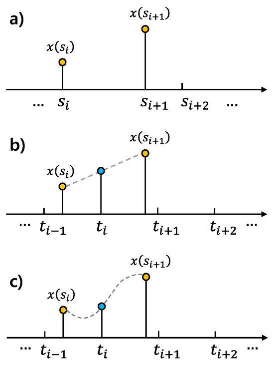 (a) Irregular timing samples. (b) Linear interpolation. (c) Cubic spline interpolation.