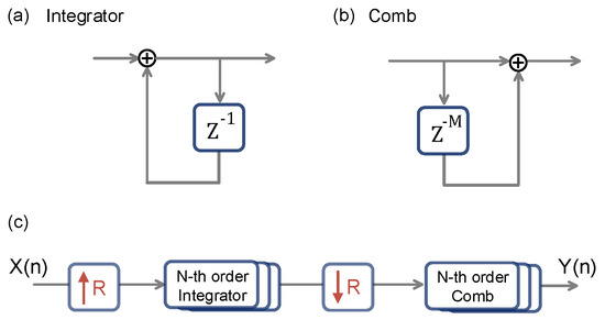 CIC filter. (a) The integrator filter accumulates the input signal by summing its current and previous values, effectively smoothing the signal and applying a low-pass filtering effect. (b) The comb filter functions as a differentiator by subtracting the delayed signal from the current signal, with the delay determined by parameter M. (c) CIC filter with up/down sampling rate R. The CIC filter structure consists of upsampling by a factor R, followed by cascaded N-order integrator filters. After downsampling, the signal is passed through N-order comb filters, effectively achieving filter interpolation.