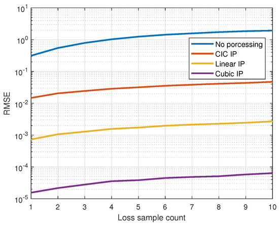 Root mean squared error (RMSE) versus the count of lost samples, comparing signal reconstruction accuracy with no processing and different interpolation methods. Each simulation was conducted for a specific loss sample count, comparing signals sampled under normal conditions with unprocessed signals and those reconstructed using interpolation methods.
