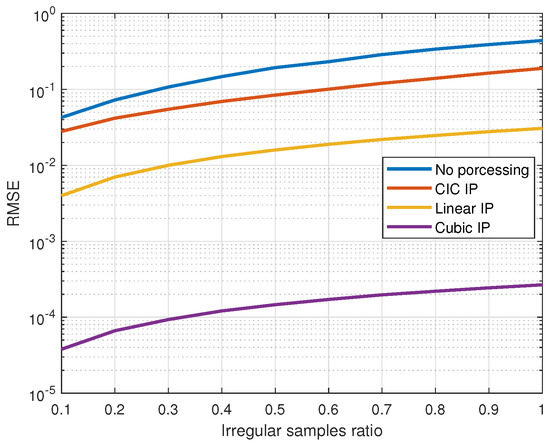 Root mean squared error (RMSE) versus the irregular sample ratio, comparing signal reconstruction accuracy with no processing and different interpolation methods. Each simulation was conducted for a specific irregular sample ratio, comparing signals sampled under normal conditions with unprocessed signals and those reconstructed using interpolation methods.