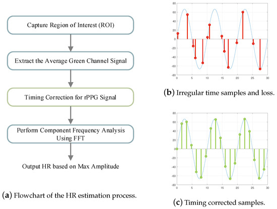 Timing correction for rPPG signal. (a) The flowchart illustrates the steps in HR estimation, including ROI extraction, green channel averaging, timing correction, frequency analysis using FFT, and HR determination based on the maximum amplitude. (b) The rPPG signal with irregular time samples and sample loss. (c) Timing correction improves HR estimation by interpolating rPPG samples to create a signal with consistent time intervals.