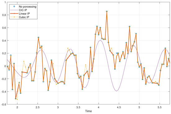 Filter interpolation estimates values between discrete sample points by applying a filtering process. This approach is commonly used in signal processing to create smooth transitions between sampled points or to reconstruct a continuous signal from discrete samples. Furthermore, filter interpolation can reduce noise, minimize aliasing, and it generate a smoother and more coherent signal. For low-complexity applications, cascaded integrator–comb (CIC) filters are an efficient solution for interpolation. CIC filters are digital filters that do not require multipliers, making them highly suitable for hardware implementations due to their computational efficiency. As illustrated in Figure 2, the sampled data are first upsampled by inserting zeros between data points to increase the resolution. The upsampled signal is passed through a cascade of N-th order integrators, which smooth out the sharp transitions caused by the zero insertion. After integration, the signal is downsampled by a factor of R and then passed through a cascade of N-th order comb filters. These comb filters act as differentiators by subtracting signals delayed by M, thereby refining the signal and producing the resampled target signal. By combining decimation with a simple filter structure that requires no multipliers, CIC filters significantly reduce computational complexity. This makes CIC filters especially advantageous in interpolation applications that demand high data throughput with minimal computational overhead.