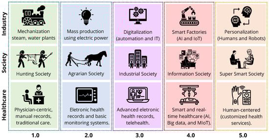 Healthcare 1.0 emerged during the Hunting Society, characterized by physician-centric care, manual records, and traditional face-to-face interactions. Society 2.0 is characterized by the transition to the Agrarian Society. Healthcare 2.0 introduced electronic health records and basic monitoring systems, reflecting the development of more organized and stationary communities. The Industrial Society is marked by the industrial revolution, while the rise of Healthcare 3.0 featured advances in electronic health systems and the emergence of telehealth, aligned with mass production and the widespread use of electric power. Society 4.0 brings the Information Society, while Healthcare 4.0 brought digitalization, smart monitoring, and the integration of AI and Internet of Medical Things (IoMT) into care systems, mirroring the rise in smart factories. Finally, Healthcare 5.0, embedded within the Super Smart Society (Society 5.0), represents a fully personalized, human-centered model where collaboration between intelligent systems and healthcare professionals enables real-time, ethical, and efficient patient care. This trajectory highlights how shifts in social priorities and industrial capabilities have continuously shaped the delivery of healthcare [,,], especially in the last few years, when the world has changed faster. It is important to emphasize that the adoption of these paradigms varies globally; for example, while some regions still operate under Healthcare 3.0 principles, others are already experimenting with 5.0 approaches.