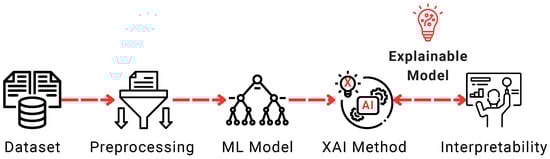 Figure 2 illustrates a typical pipeline for XAI. It begins with the dataset, which undergoes preprocessing to prepare the data for training. An ML model is then trained, such as Gradient Boosting, Naive Bayes, Decision Tree (DT), or K-Nearest Neighbors. After model training, a particular post hoc XAI method—such as Local Interpretable Model-Agnostic Explanations (LIMEs), Shapley Additive Explanations (SHAPs), and Gradient-Based Class Activation Mapping (Grad-CAM). Such methods are presented and discussed in Section 4.2. These explanations enhance the interpretability of the model, providing insights into how decisions are made and allowing end-users to understand and trust the outcomes. This process exemplifies the use of explainability as a complementary stage to model training.