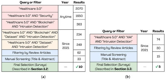 Overview of the filtering and selection process for identifying relevant surveys in the context of Healthcare 5.0. (a) Intrusion detection in Healthcare 5.0. (b) XAI applied to IDSs in Healthcare 5.0.
