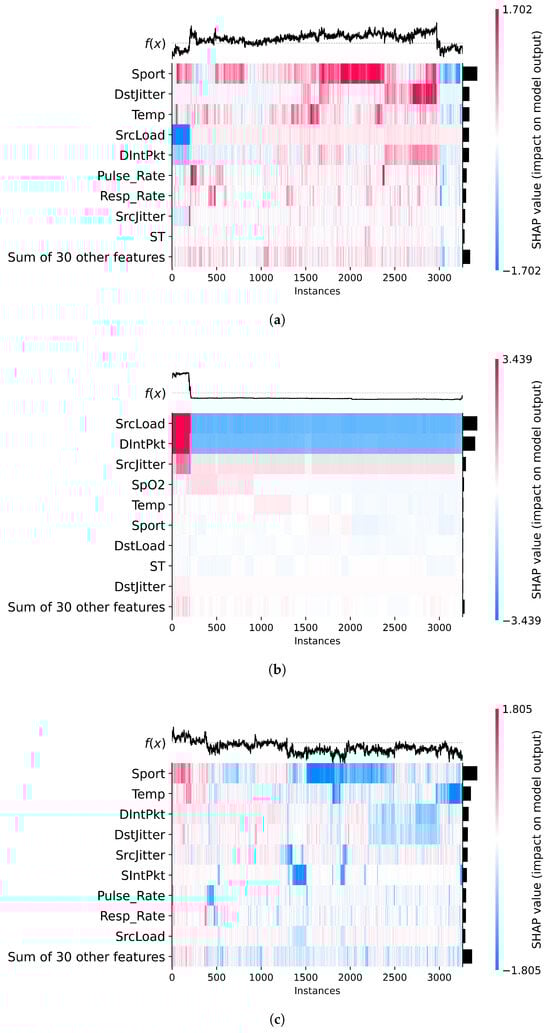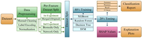 Several studies integrate SHAP to interpret model outputs. For example, ref. [] applies SHAP to ensemble classifiers such as DTs and RFs. A hybrid approach proposed by [] uses SHAP-based feature selection combined with bagging and boosting to improve model robustness and interpretability. Likewise, studies such as [,] employ SHAP in federated environments to maintain consistent interpretability across distributed models.