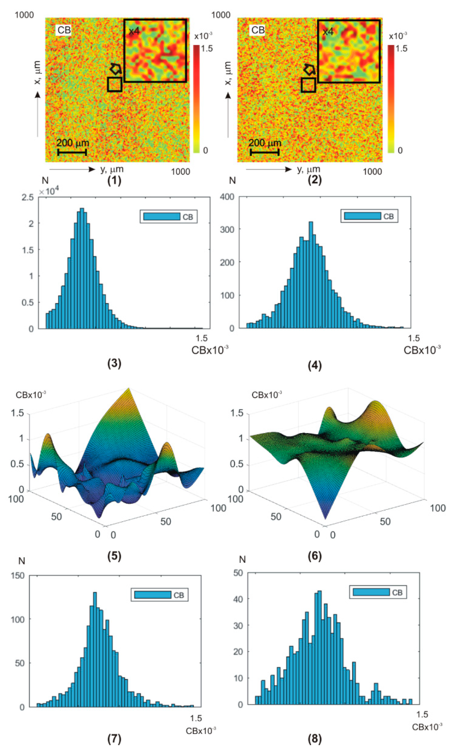 - the tendency to decrease the magnitude of fluctuations of random values of linear and circular birefringence in the phase planes ) of the field of complex amplitudes with smaller values of the scanning parameter (relationships (19) and (20))—fragments (5), (9), and (13) and (6), (10), and (14).