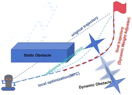 To address these challenges, this paper proposes a collaborative optimization strategy that integrates the TD3 model with MPC, as shown in Figure 1. In this approach, TD3 produces sequential local actions that roll out into a short-horizon reference path, which MPC continuously refines for real-time local adjustments. A dynamic weight adjuster fine-tunes the trajectory to enhance obstacle avoidance and improve navigation efficiency.