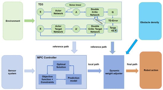 In dynamic and complex environments, robot trajectory planning requires effective coordination between global path planning and real-time local optimization while addressing challenges such as dynamic obstacles and diverse scenarios. Figure 2 illustrates the proposed framework, which integrates TD3 with MPC to balance global decision-making and local adjustments. TD3 employs a learnable noise layer design to enhance exploration capabilities and robustness, outputting sequential local actions that, when rolled out, form a short-horizon reference path while optimizing long-term cumulative rewards. Meanwhile, MPC incorporates dynamic obstacle prediction and kinematic constraints to perform real-time local trajectory optimization and dynamic obstacle avoidance. The two components collaborate adaptively through a dynamic weight adjustment module, which allocates control strategy weights based on obstacle density and environmental complexity. This synergy enables the generation of smooth, safe, and efficient robot control commands. The framework achieves closed-loop optimization at both global and local levels, providing an efficient and robust solution for robot navigation in challenging environments.