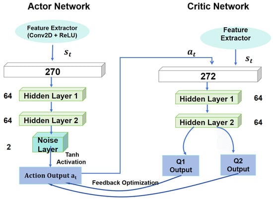To improve the exploration capability and convergence stability of the TD3 in dynamic environments, this study integrates a noise layer into the output layer of the actor network while retaining the dual Q-network architecture in the Critic network [], forming the overall framework shown in Figure 4.