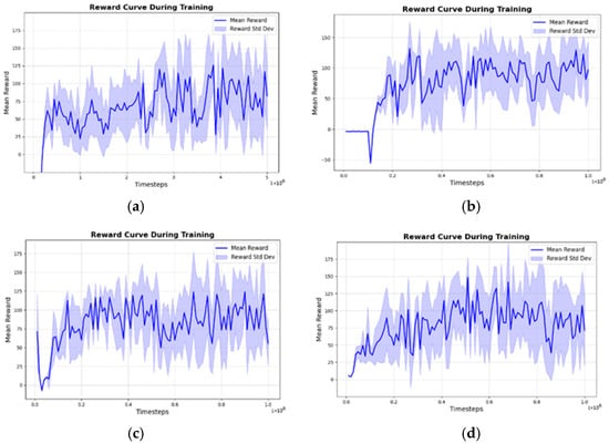 The baseline TD3 model without noise integration (Figure 5a) converges locally around a reward value of 70. Replacing the Actor output layer with a noise layer (Figure 5b) overcomes this premature convergence and yields a substantially higher final reward. Perturbing both the Actor and Critic outputs (Figure 5c), however, reduces stability and results in a lower final reward, confirming that noise at the Critic side injects variance into Q-value estimation and hinders convergence. Similarly, perturbing both the Actor output and a hidden layer (Figure 5d) initially boosts exploration but later causes sharp fluctuations and even declines, indicating that excessive noise interference outweighs any transient benefit.