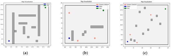 Evaluation Maps: (a) Scene A: Static regular obstacle distribution; (b) Scene B: Dynamic random obstacle distribution; (c) Scene C: High-density random obstacle distribution.