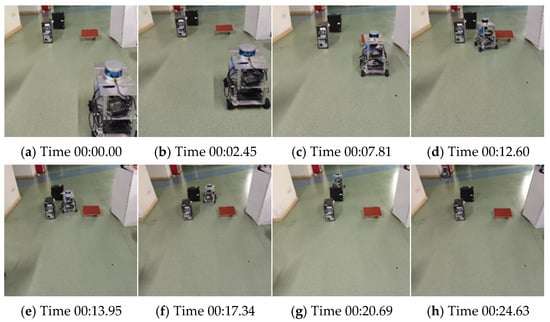 Real-world deployment and validation of the self-assembled mobile robot platform. The time-stamped images illustrate the robot’s real-time navigation and obstacle avoidance process in a structured indoor environment.