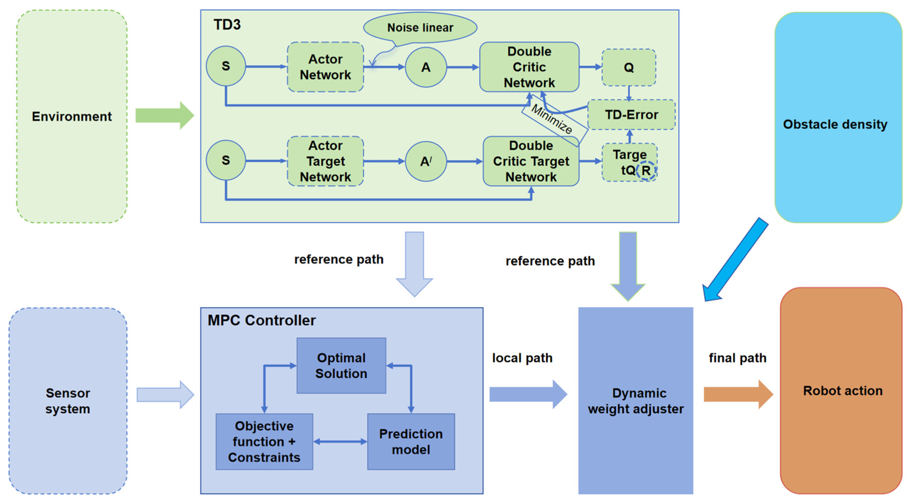 Figure 1. In this approach, TD3 produces sequential local actions that roll out into a short-horizon reference path, which MPC continuously refines for real-time local adjustments. A dynamic weight adjuster fine-tunes the trajectory to enhance obstacle avoidance and improve navigation efficiency.