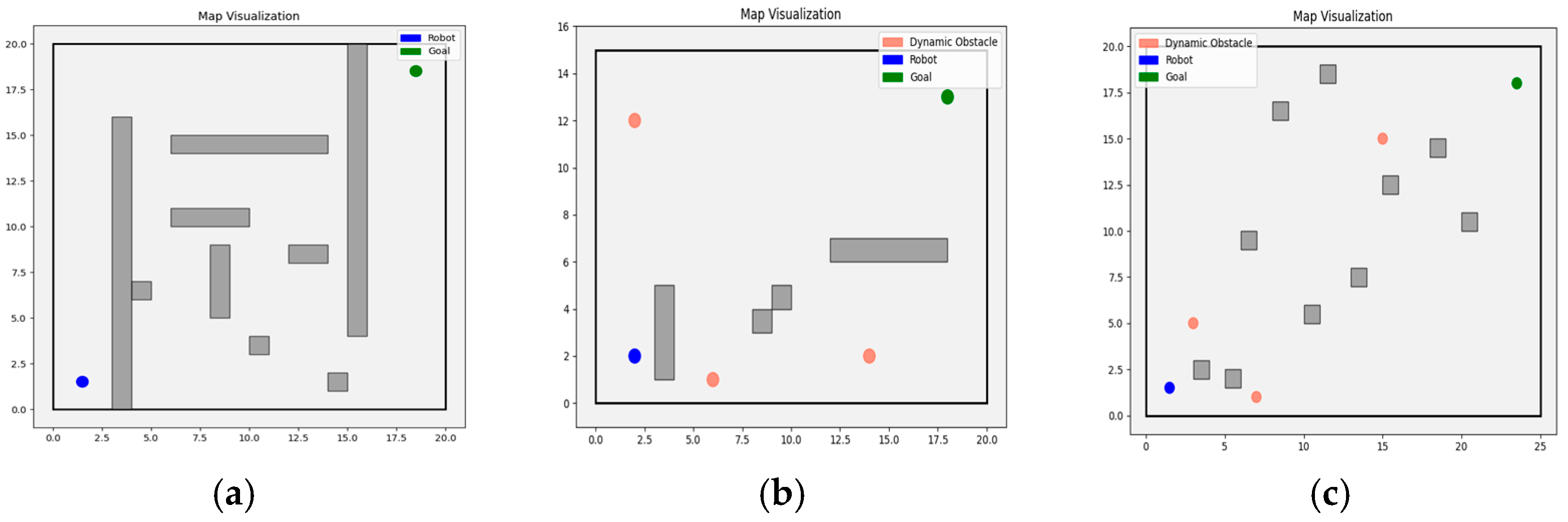 23], featuring more dynamic obstacles, more complex obstacle distributions, and higher task difficulty. The aim is to comprehensively test the algorithm’s adaptability in dynamic environments, narrow passages, and dense obstacle scenarios.