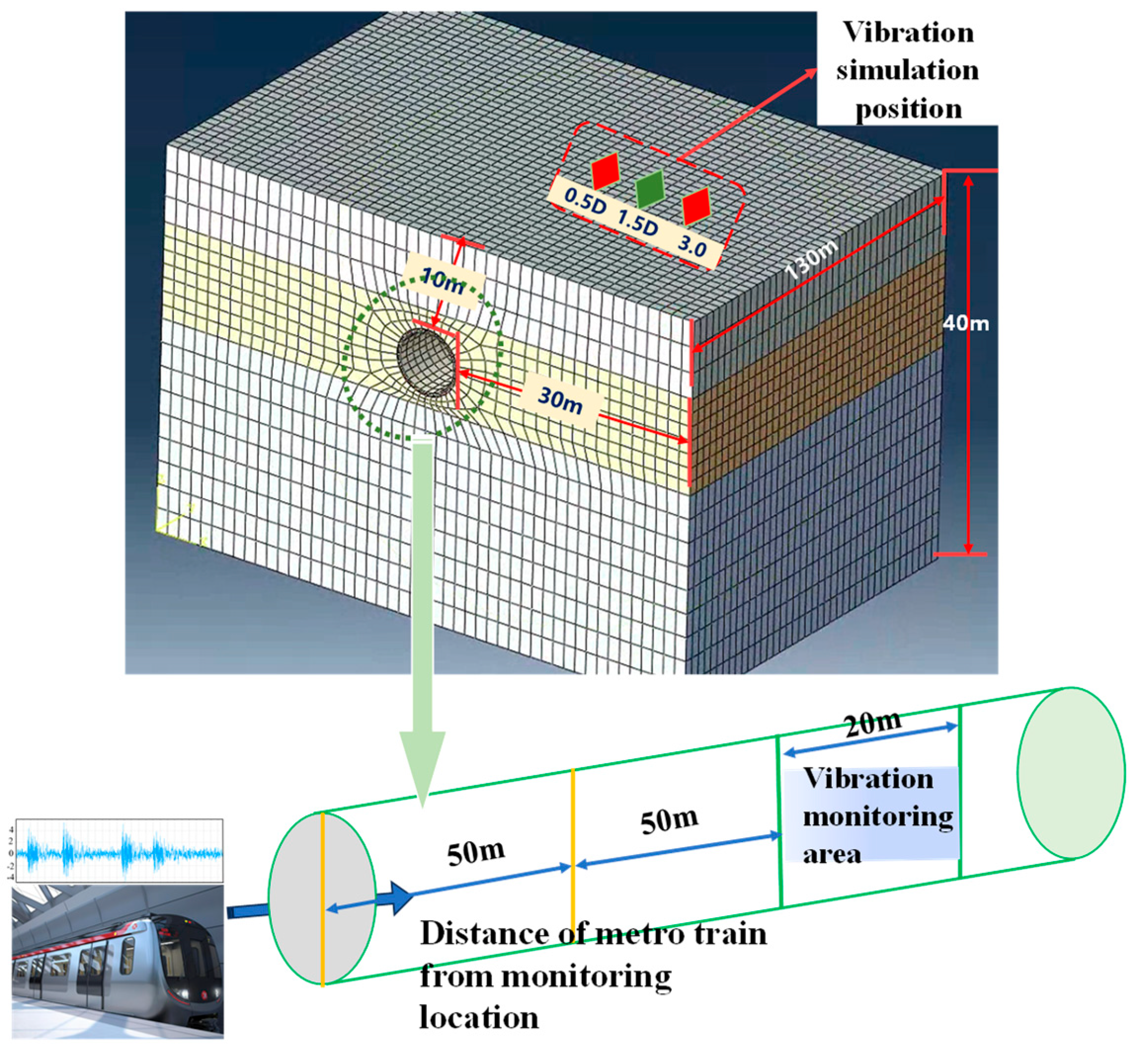 3.1. Numerical Simulation of the Abnormal Vibration of the Metro Protection Area